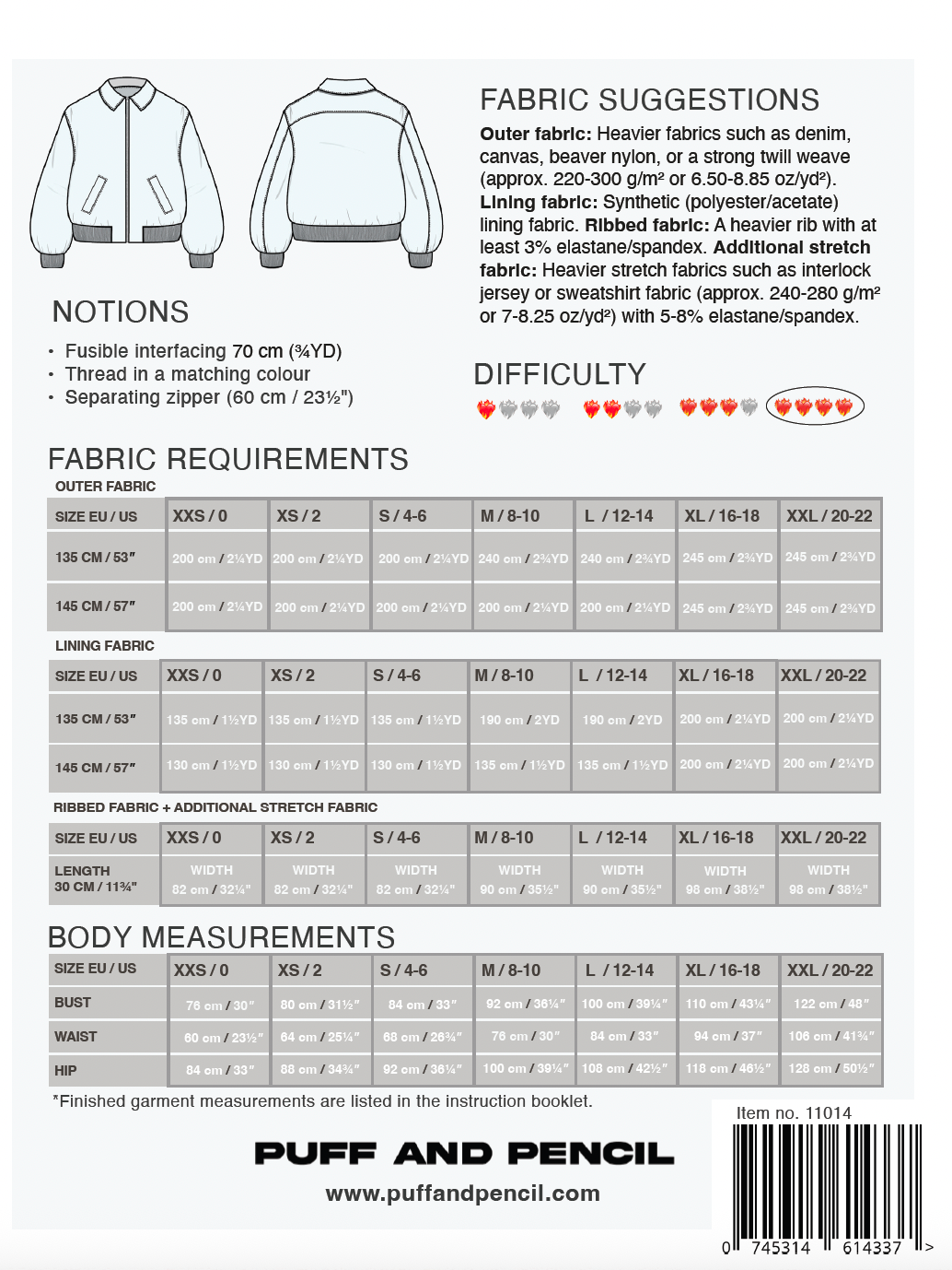 The pattern comes with all sizes from EU XXS-XXL / US 0-22. The most important measurement for this jacket is the bust. The models in the photos are approx. 178 cm tall and 165 cm tall and they are wearing a size S and an adjusted size XL.