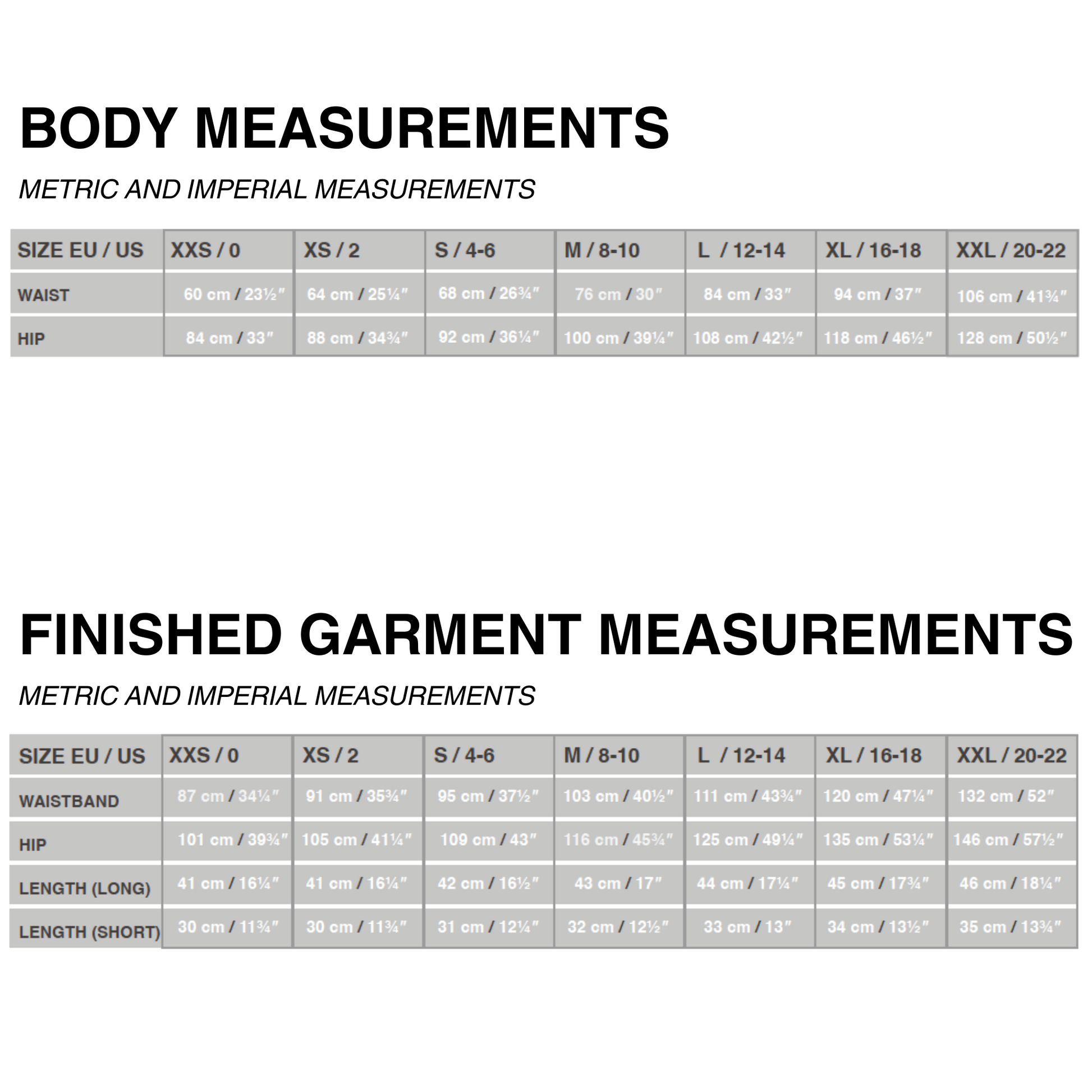 XS (2): Waistband: 91 cm (35 3/4"), Hip: 105 cm (41 1/4"), Outer seam long: 41 cm (16 1/4"), Outer seam short: 30 cm (11 3/4")