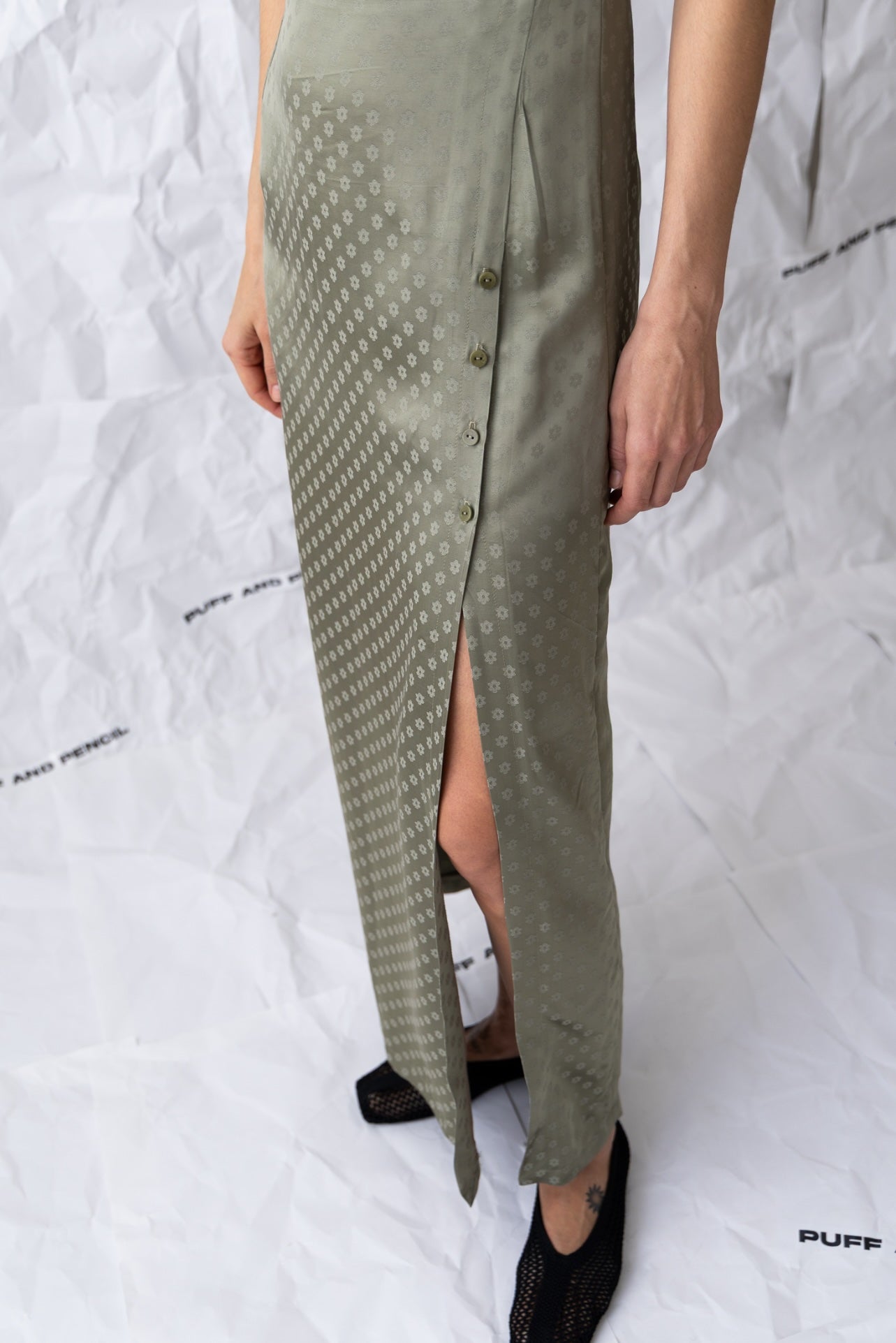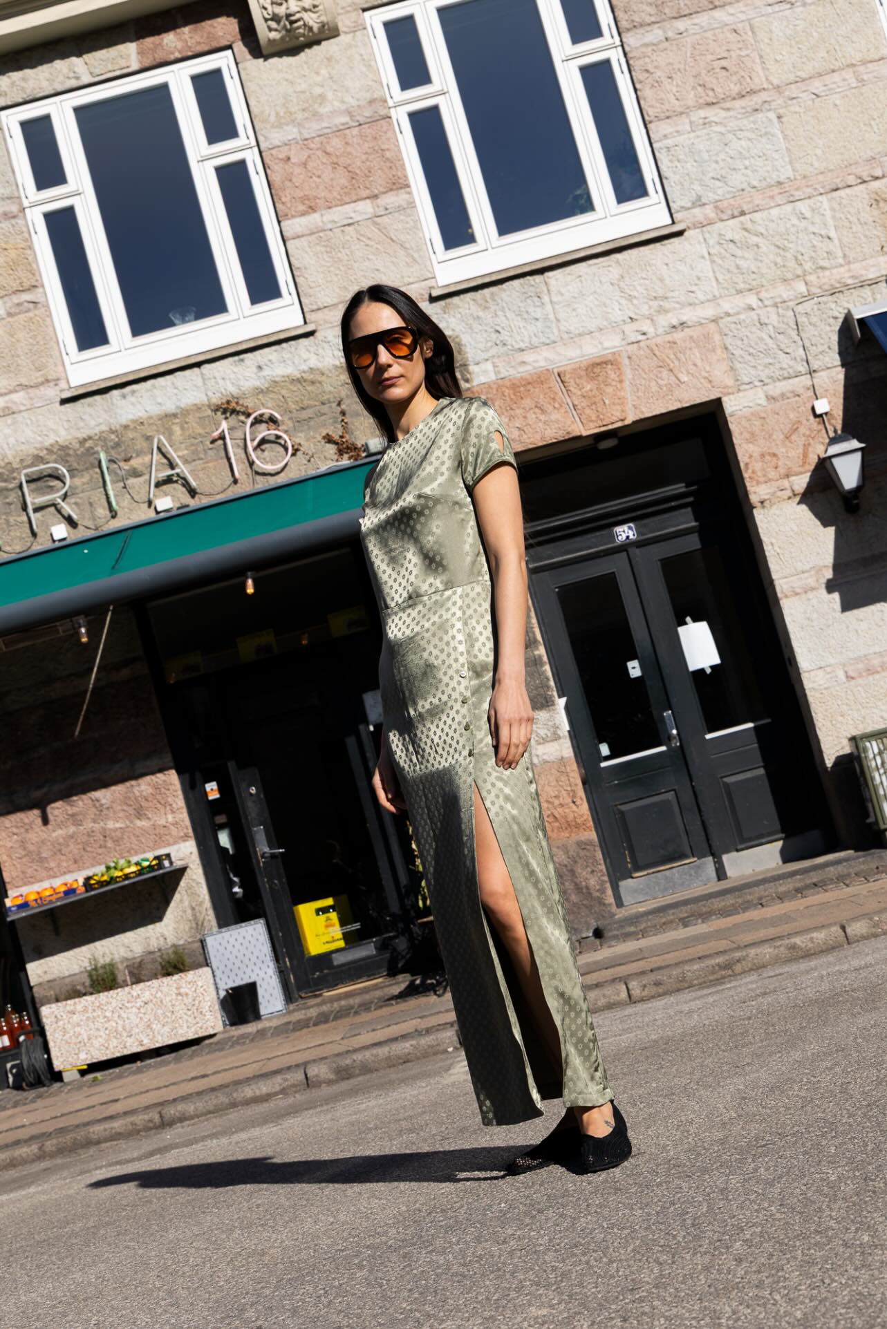 The MOON Dress is a fitted style with a round neckline and a skirt that starts at the waist. The skirt includes a slit that fastens with four buttons.