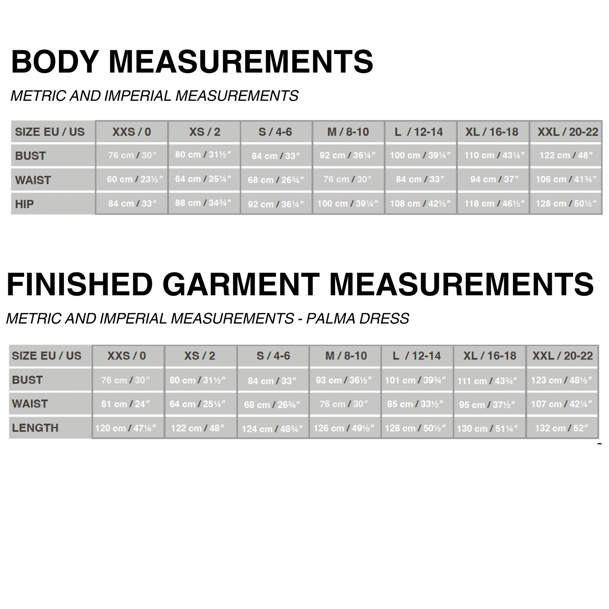 XXS (0): Bust: 76 cm (30”), Waist: 61 cm (24”), Length: 120 cm (47 1/4”)