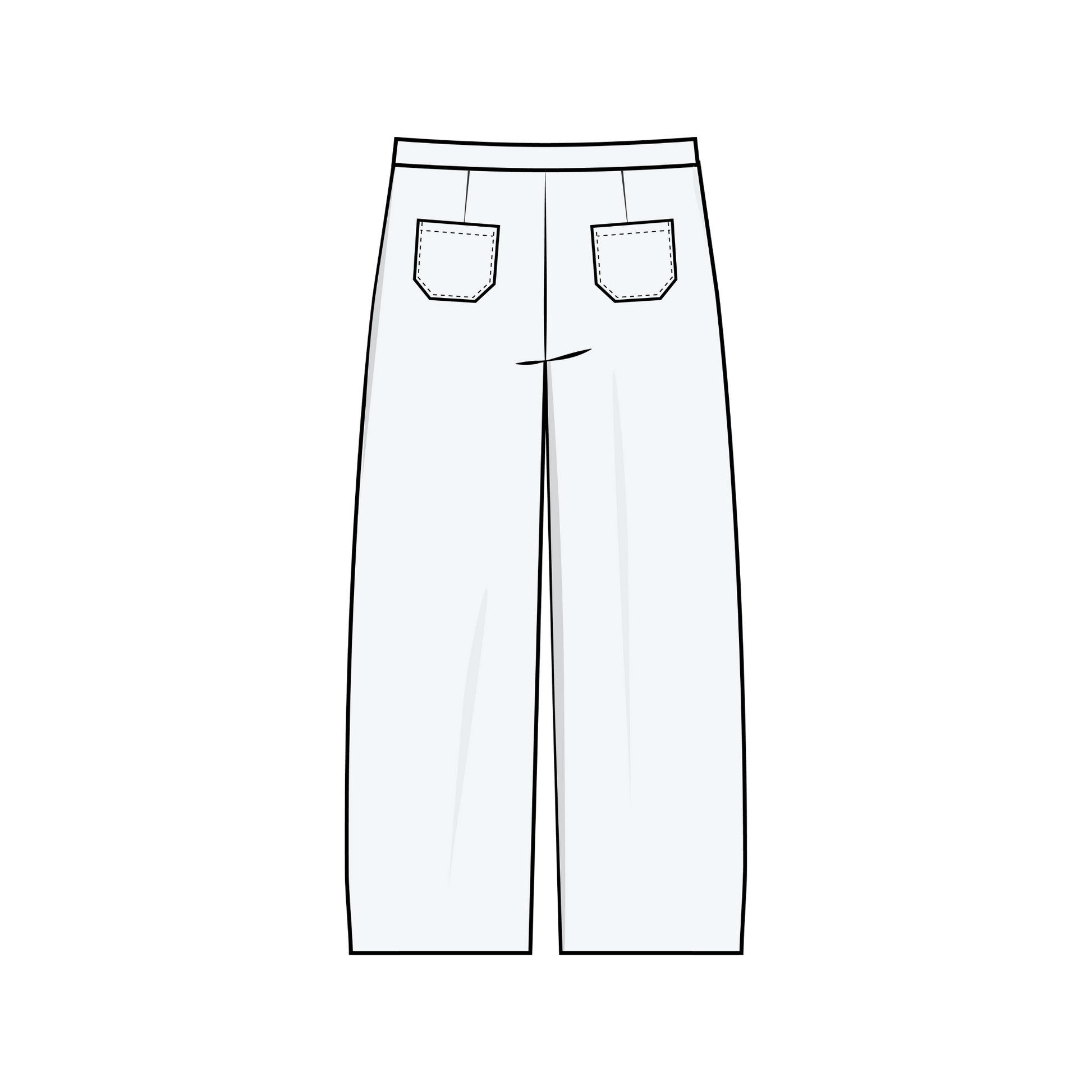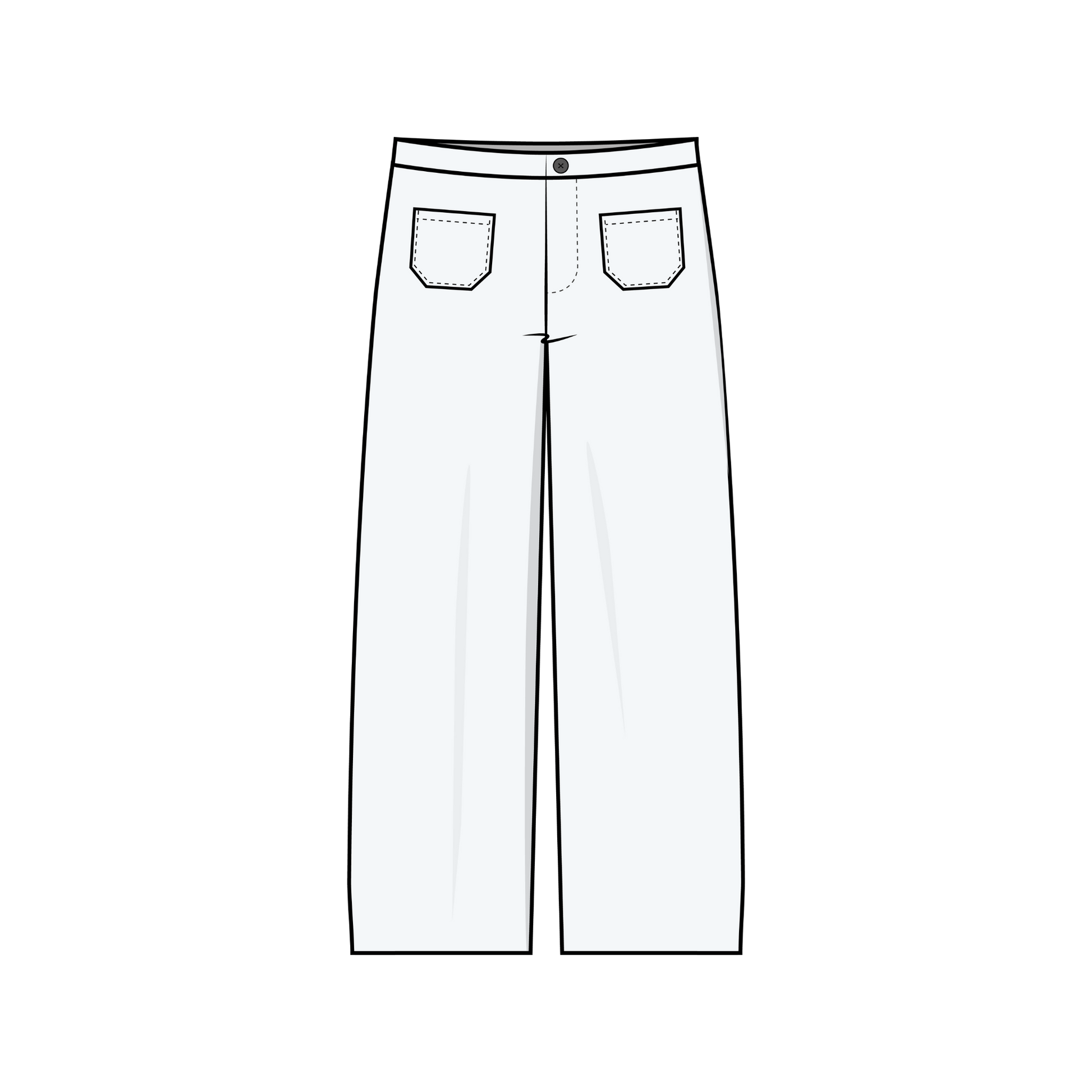 The PEACHY Pants feature a mid-rise design with wide, slightly curved pant legs. The pants have a fly with an underlap, secured by a zipper and a button closure. They include a waistband, darts at the back, and patch pockets that can be placed either on the front and/or on the back.