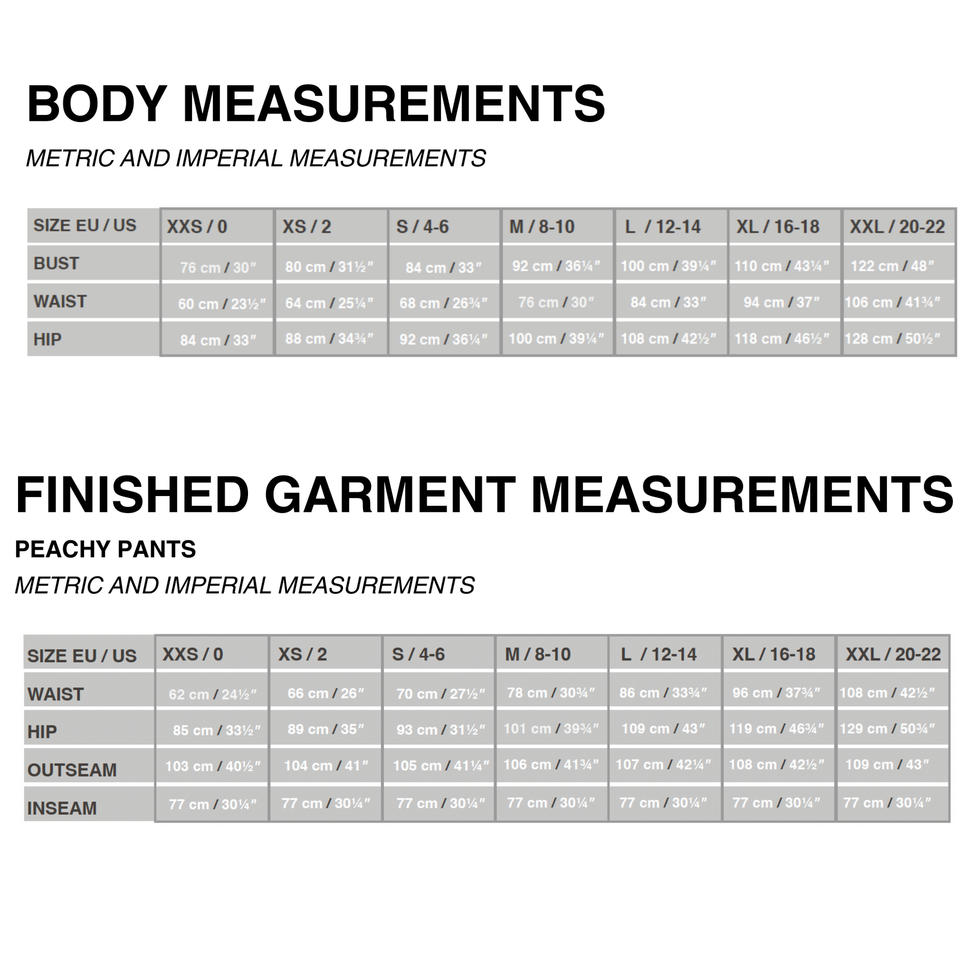 XXS (0): Waist: 62 cm (24 ½”), Hip: 85 cm (33 ½”), Outseam: 103 cm (40 ½”), Inseam: 77 cm (30 ¼”)