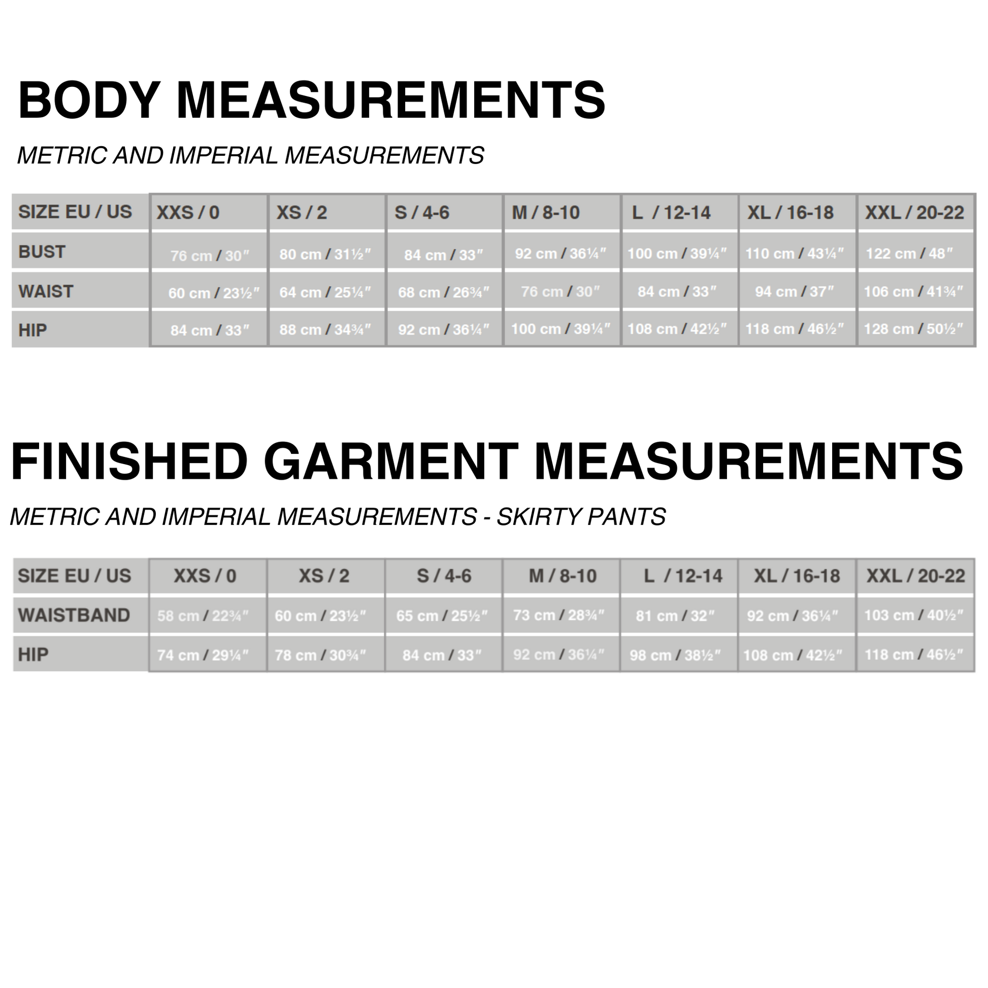 XXL (20-22): Bust: 122 cm (48"), waist: 106 cm (41 3/4"), hip: 128 cm (50 1/2")