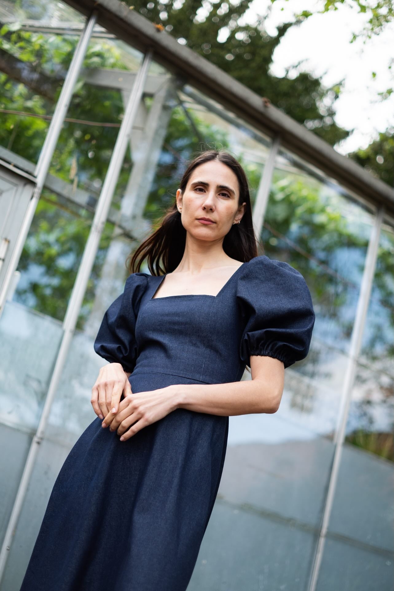 The SQUARE Dress features a square neckline and princess seams at the bust for a beautifully shaped bodice. A wide smocked panel at the back provides a snug fit and makes the dress easy to put on and take off. The full skirt falls to a mid-calf length.