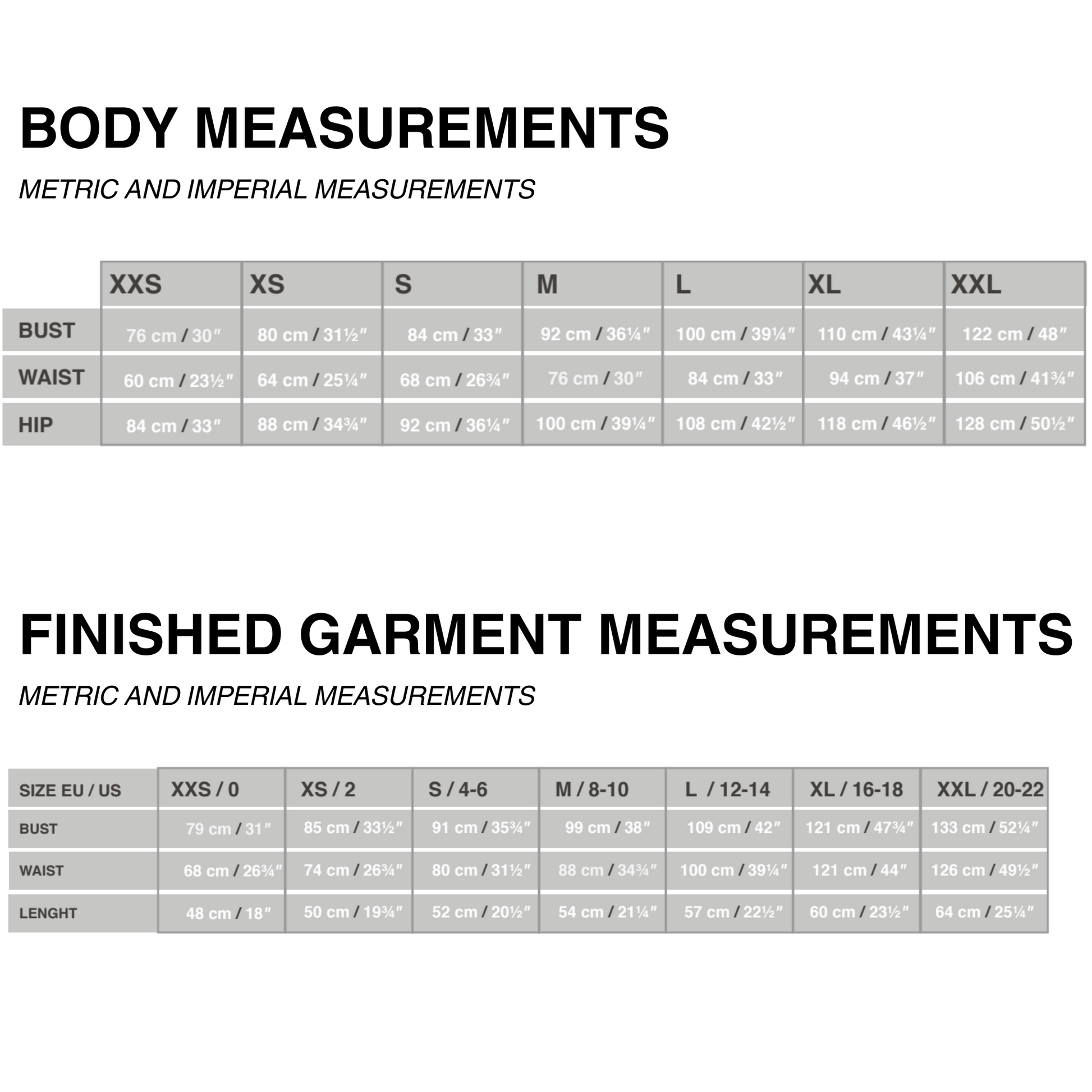 XL: Bust: 110 cm (43 1/4"), waist: 94 cm (37"), hip: 118 cm (46 1/2")