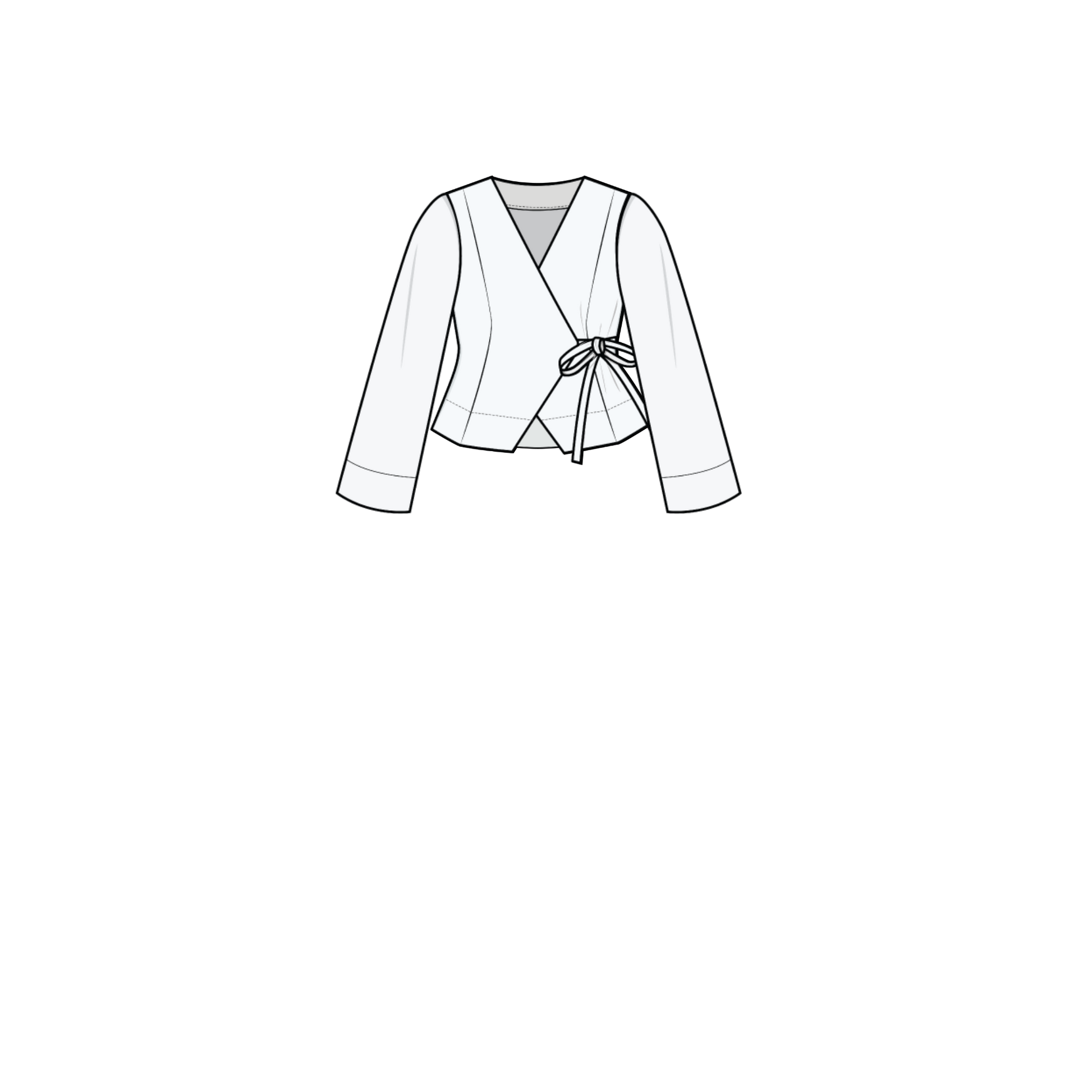 The WRAP Blouse is a loose-fitting blouse with two front pieces that overlap and are tied with a wide tie on the outer left side.